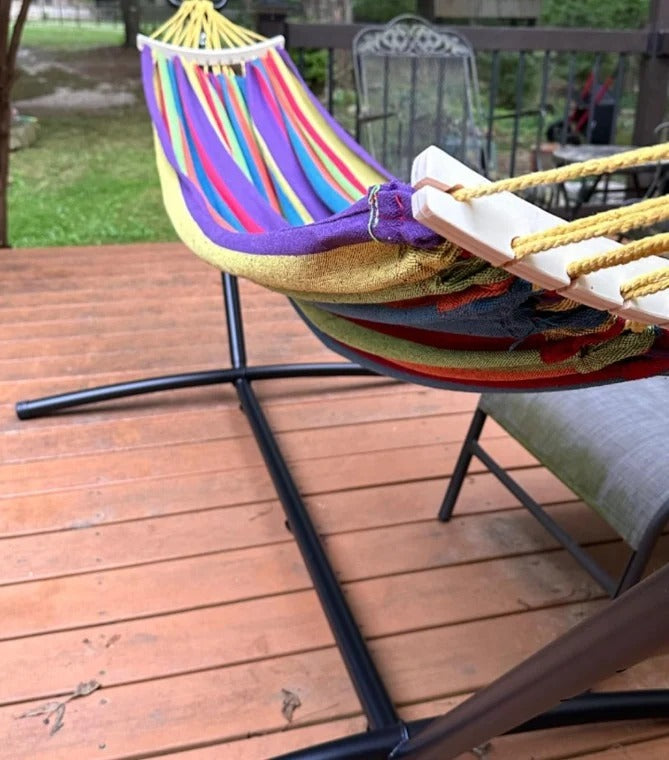 Fabricada con materiales premium y un soporte de acero reforzado, la hamaca aguanta el peso de dos personas sin perder estabilidad ni seguridad.